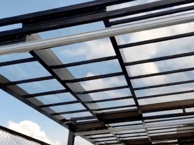 Ela pode ser fabricada com diferentes materiais, como lona PVC, policarbonato ou vidro, sempre instalada sobre uma estrutura em alumínio ou aço galvanizado, garantindo resistência, segurança e longa vida útil.
